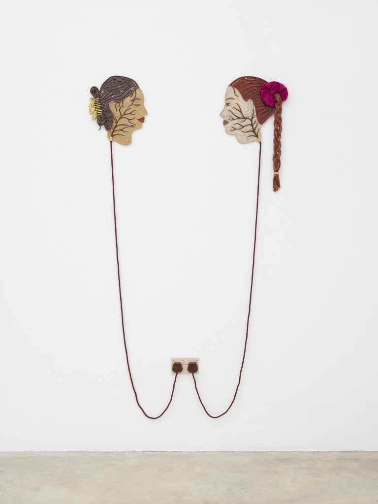 Paloma Proudfoot, Stitches, 2022, glazed ceramic, metal bolts, rope, 142 × 61 × 2 cm (figure), other parts at variable dimensions
