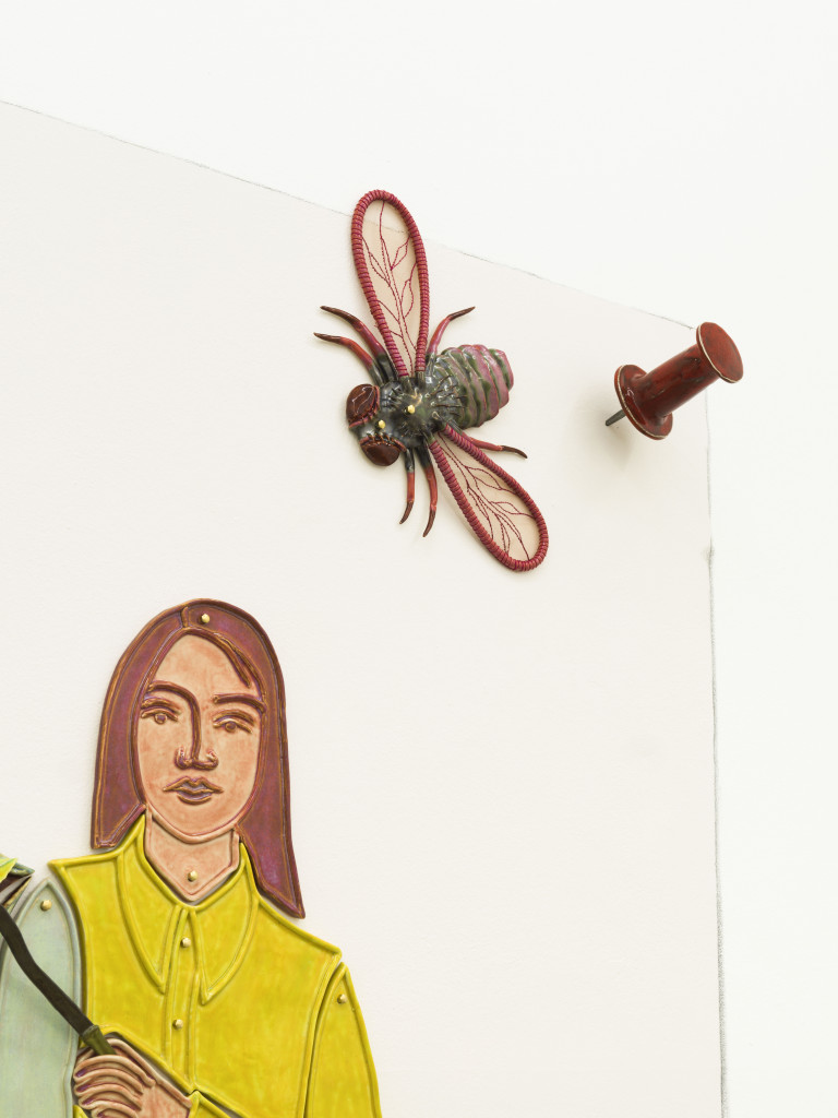 Paloma Proudfoot, A fly like you (I), 2023, glazed ceramic, embroidered gauze, bolts, 40 × 20 × 4 cm