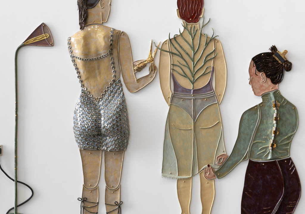Paloma Proudfoot, The three living and the three dead (detail), 2022, glazed ceramic, bolts, 220 × 438 × 3 cm
