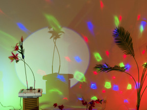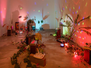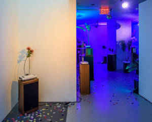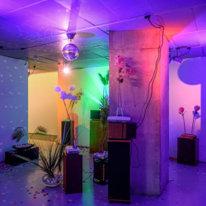 Rachel Youn, Underparty, 2021, massagers, artificial plants, found furniture and speakers, sound