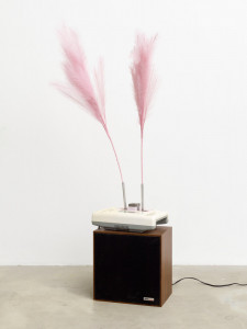 Rachel Youn, Fanatics, 2020, massager, artificial plant, speaker cabinet, 36 × 28 × 133 cm