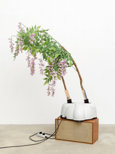 Rachel Youn, Wild, 2020, massager, artificial plant, speaker cabinet, 83 × 80 × 60 cm