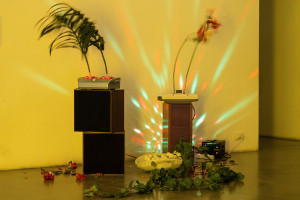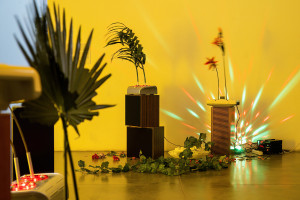 Rachel Youn, Gather, 2020, massagers, artificial plants, found furniture and speakers, sound