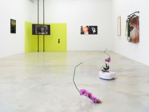 Rachel Youn, Untitled, 2022, shiatsu massager motor, artificial flowers, tablet stand, 147 × 91 × 51 cm