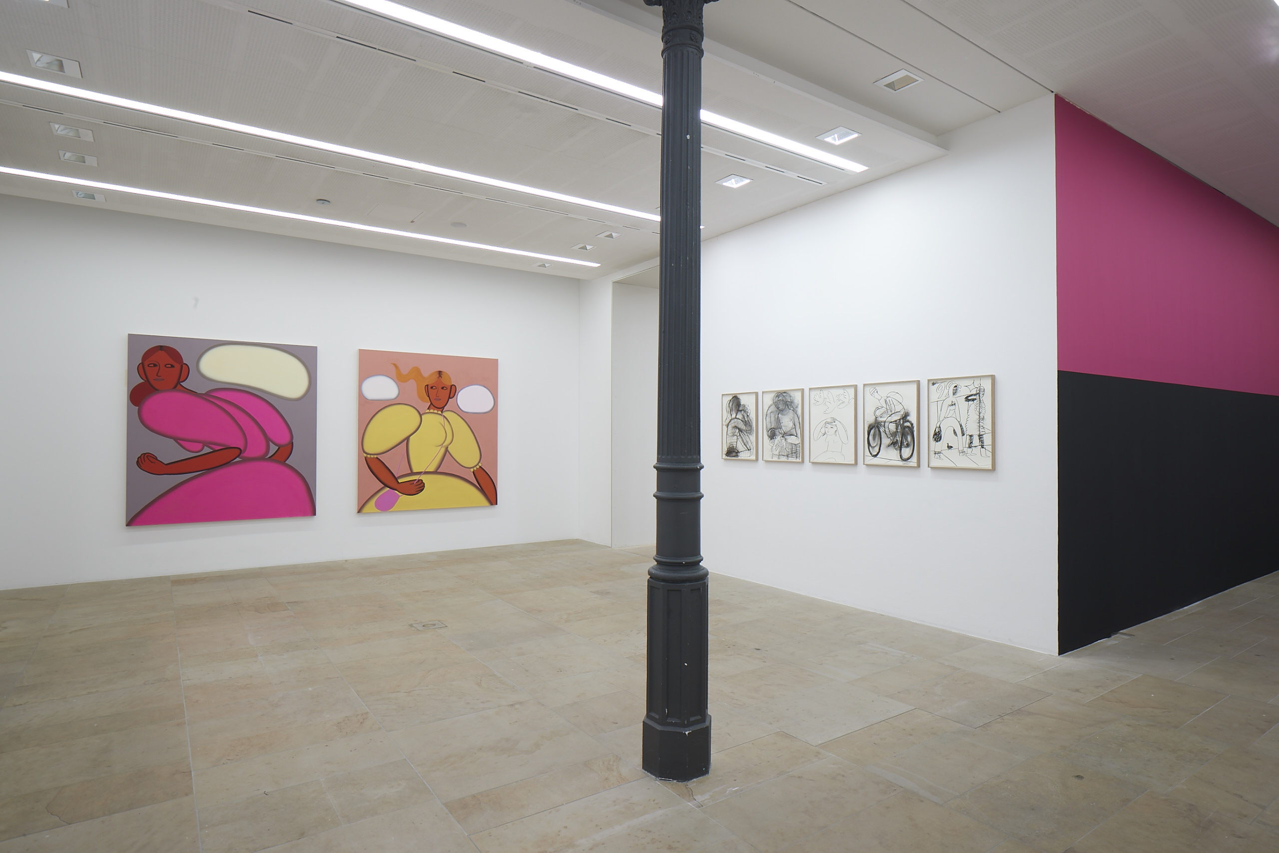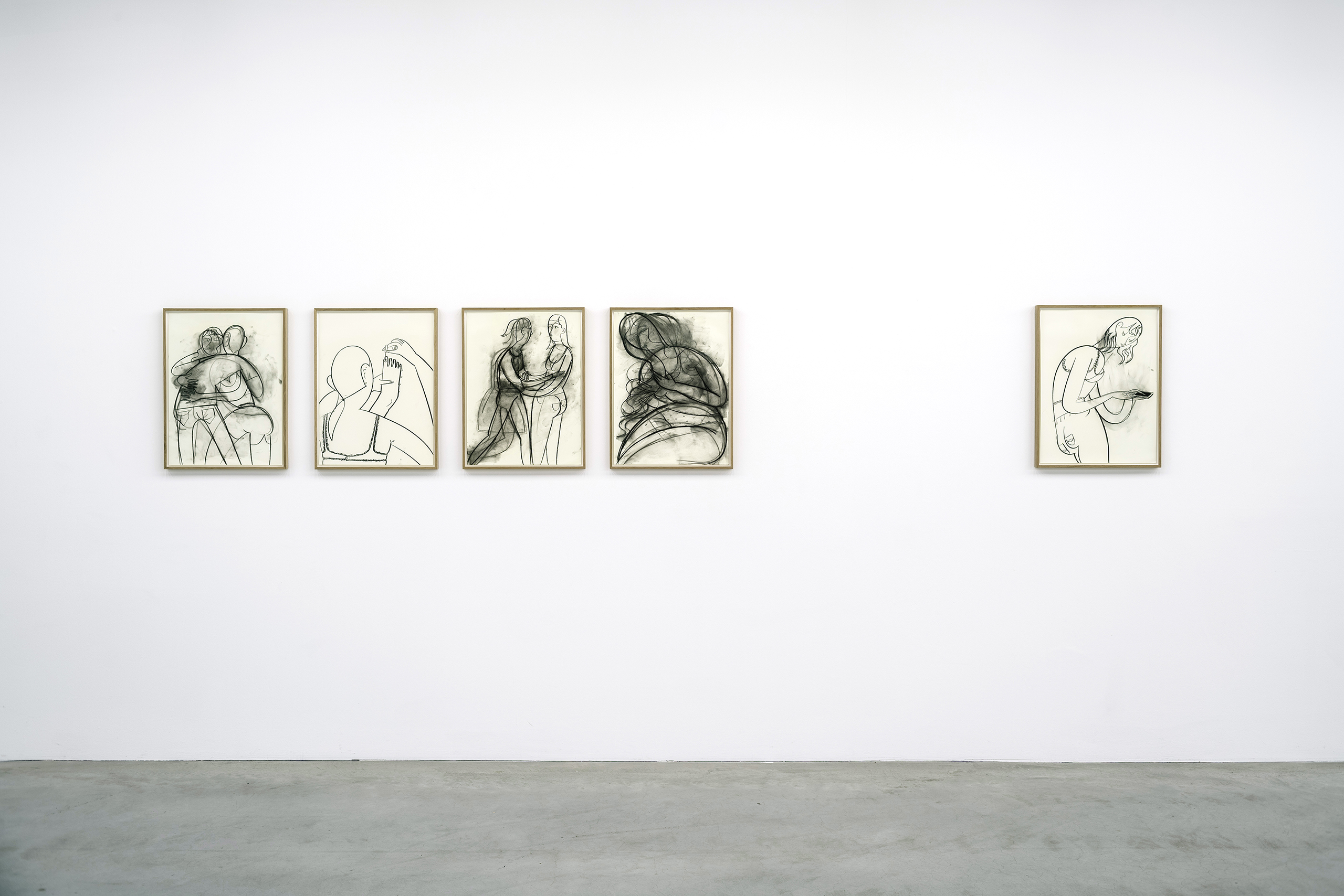 Corresponding with this are Weaver’s most visible erasures, wipe-outs and omissions. Her willful acts of effacing figures and motifs or of excavating the phantoms of compositional spheres buried deeply underneath the surface reunite the paintings with their previously concealed conception and, what is more, her drawing practice. For in her charcoals, she is relentless. She contorts and dislocates her personae over and over, until eventually they make a stand in a world of their own. Including each and every mishap or individual misstep.