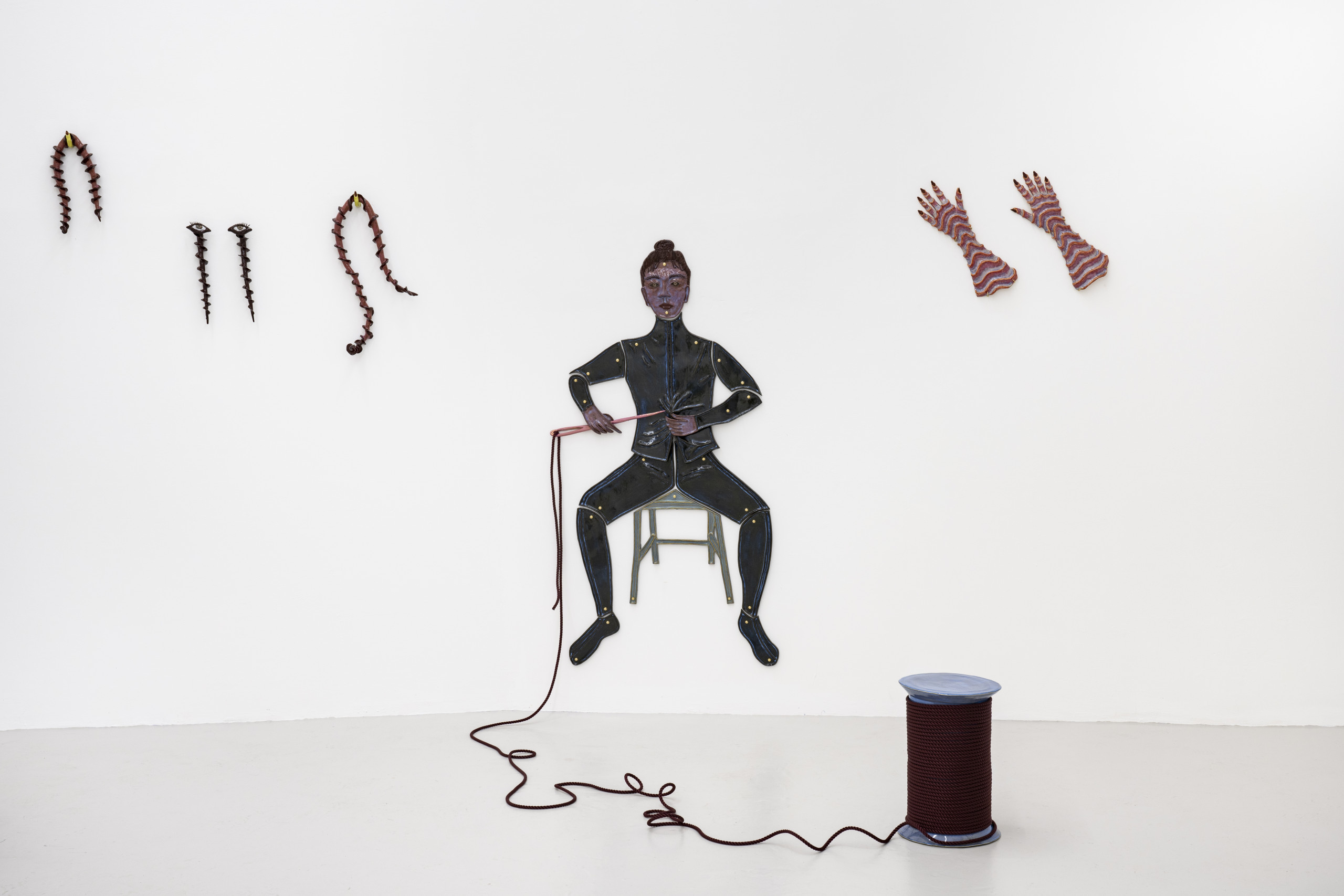 Exploring the role mannequins play in perpetuating myths of idealised beauty, Paloma Proudfoot’s frieze-like sculptural ceramic relief takes us behind the scenes of a fashion runway show, to expose the labour and body politics that underpin the performance of glamour. Bristling with tension, the scene depicts a series of intertwined figures tucking in hems, making last-minute adjustments, and coiffing hair. A closer look reveals branch-like forms emerging from a spine and vacuous, gormless faces, while menacing secateurs and clothing pinched with bulldog clips imbue the scene with a frisson of unease. With a background in textiles and pattern-cutting, Proudfoot’s seductive glazed-ceramic construction, which also incorporates textiles, draws on punk aesthetics and fetish fashion. By appropriating and subverting the symbol of the mannequin, which Proudfoot invariably depicts as an ‘automaton’, she transforms them into critical signifiers for complex female subjectivities.