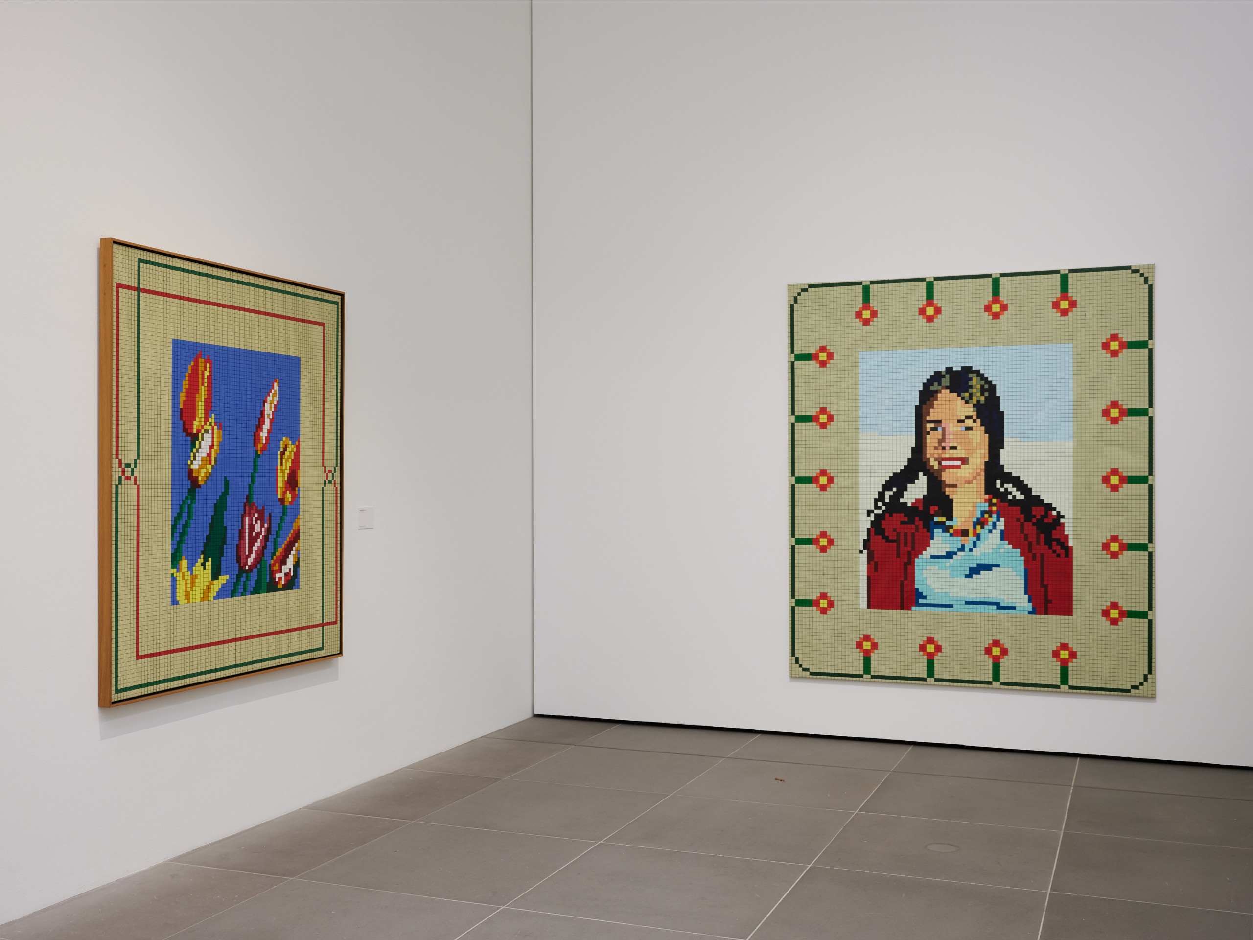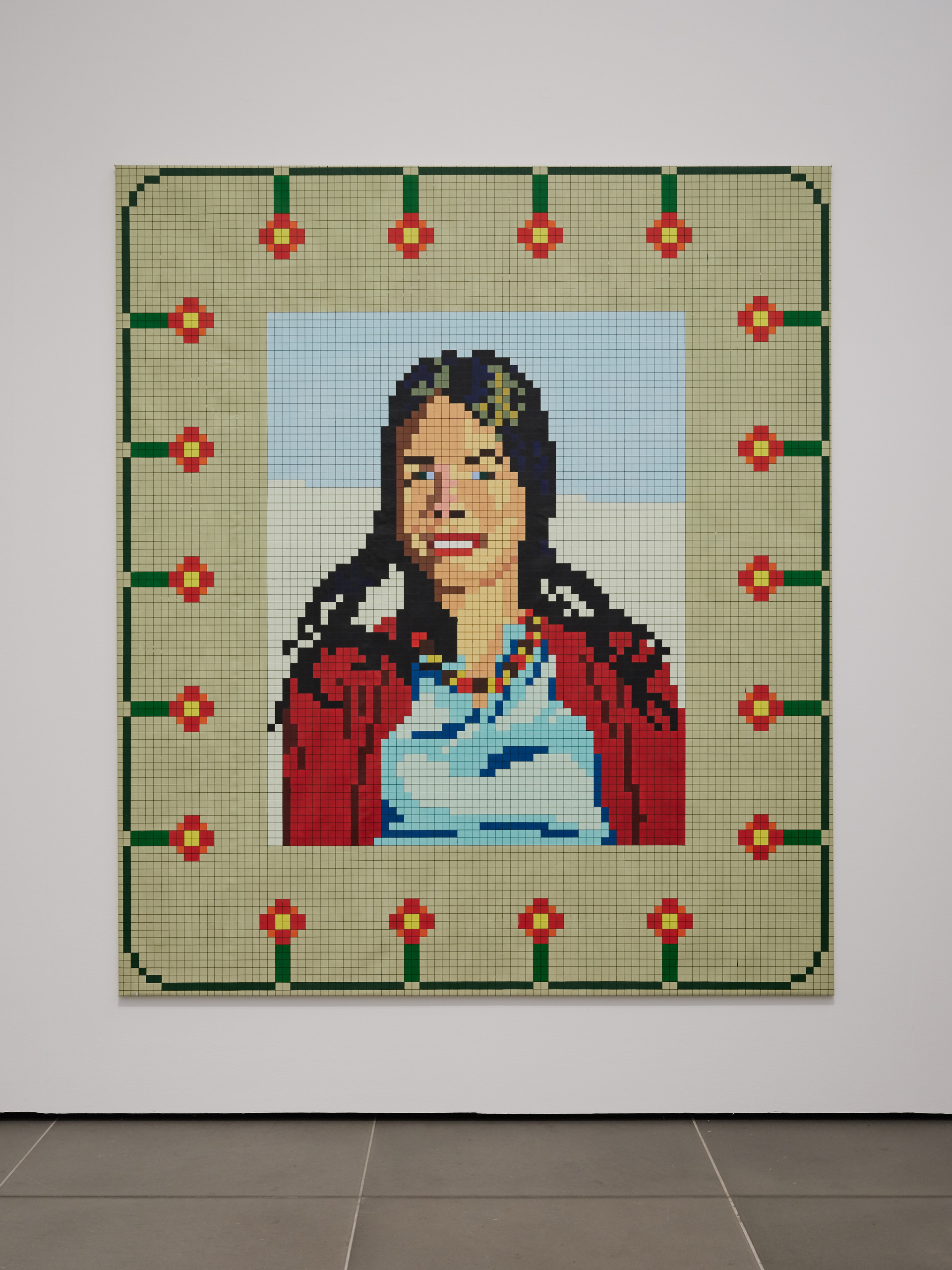 By observing the works on display, a discernible grid structure emerges, a framework Voigt skillfully employs and which he copied from his mother’s embroidery work. The pieces on display not only demonstrate Voigt’s adeptness at drawing from textile works but also underscore his unique departure from the traditional modernist – that is, abstract – approach to the grid. In his practice, the grid is not used to replace the figurative image; rather, it serves as a formal tool for representing it, similar to the way it is utilized in embroidery. The developments of recent decades, especially with regard to the emergence of feminist art history, have proven the textile medium to be historically significant medium, and allow Voigt’s works to be viewed from a different angle and re-evaluated. Drawing from the traditionally female-associated medium of textile art, Voigt’s works simultaneously predict the advancement of the digital age. Through his practice, he deftly maneuvers the course of time, succinctly demonstrating the benefits of embracing new perspectives.